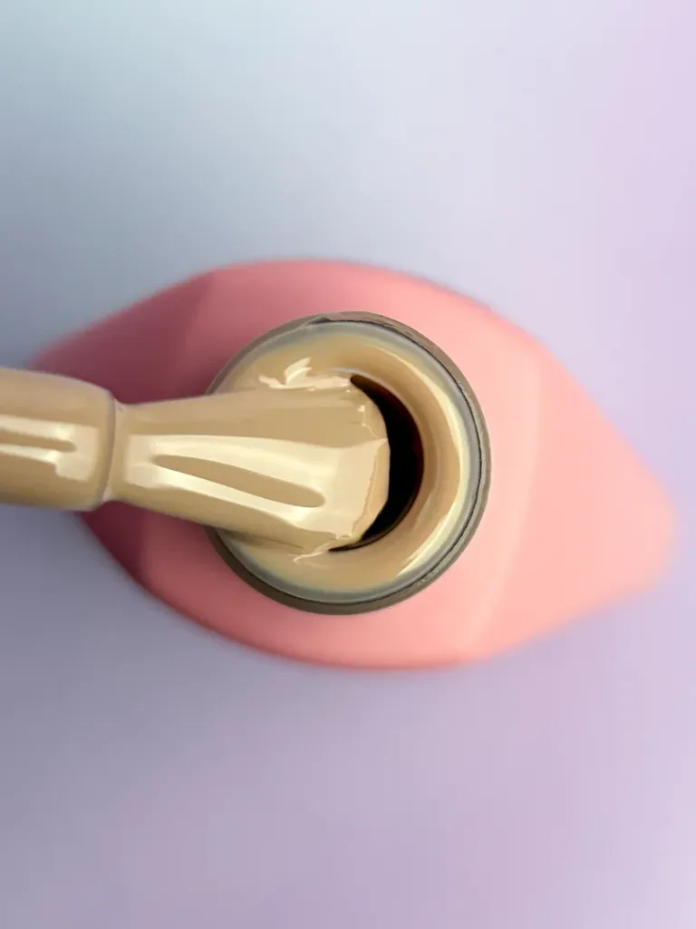 • Наносимо гель-лак (1–2 тонких шари). Набираємо матеріал на пензлик, промальовуємо центр нігтя, а потім — бічні стінки. Пензликом для тонких ліній підводимо до кутикули. Перший шар завжди має лягати напівпрозоро.