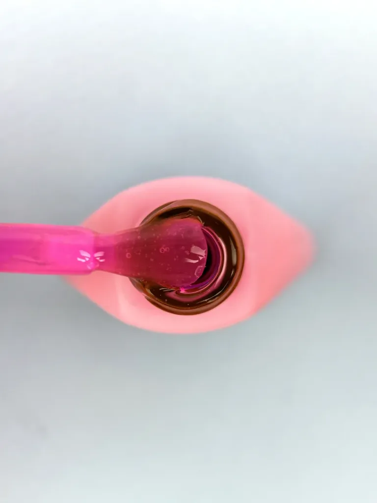 • Наносимо гель-лак (1–2 тонких шари). Набираємо матеріал на пензлик, промальовуємо центр нігтя, а потім — бічні стінки. Пензликом для тонких ліній підводимо до кутикули. Перший шар завжди має лягати напівпрозоро.